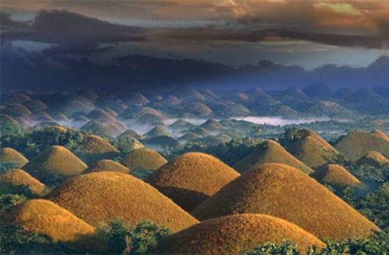 9. Dealurile de Ciocolată din Filipine sunt un fascinant fenomen natural ce constă în aproximativ 1.300 de dealuri de iarbă acoperite de calcar, iarbă care devine maronie în timpul sezonului uscat, de unde şi numele zonei.