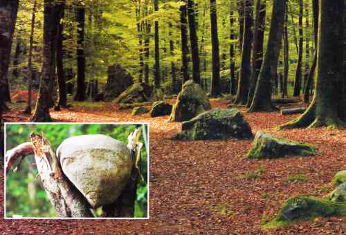 Straniu este şi faptul că pădurea este înţesată cu mii de pietre, cu forme ciudate, unele foarte mari, altele perfect rotunde, ce emit o căldură nefirească. Se spune că în aceste locuri, cu mii de ani în urmă, se adunau pelerinii pre-creştini din întreaga Europă, regiunea celor 30 de dealuri fiind una sacră. Cei care ajungeau aici nu veneau decât cu un singur scop: să aşeze într-un anumit loc piatra pe care cu osteneală o aduseseră de la zeci de kilometri distanţă. În credinţa lor, prin această caznă, ei erau izbăviţi de păcatele grele pe care le săvârşiseră, iar destinul lor se putea transforma.