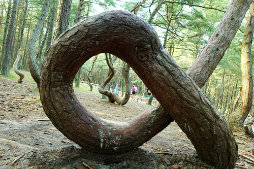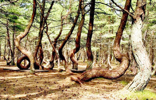 Însă, pe măsură ce te afunzi în pădure, peisajul se schimbă pe neaşteptate, transformându-se într-unul înfricoşător. În locul pinilor puternici, bine propor-ţionaţi, pe care i-ai întâlnit la intrarea în pădure, apar brusc nişte copaci stranii, ce par a fi creaturi hidoase, ca nişte şerpi ce se zvârcolesc, ţâşnind din pământ, îndoiţi, răsuciţi în inele, legaţi în bucle ciudate. În această mică parte a pădurii, de aproximativ un kilometru, arborii au încremenit în ipostaze bizare. Straniu este faptul că există o limită clară între zona „anormală” şi cea „normală”.