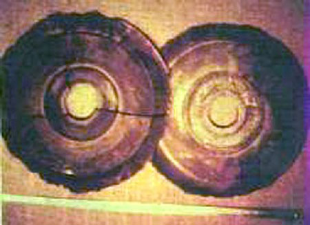 Discurile aveau diametre de cca. 30 cm, 85 mm grosime, având fiecare cioplită câte o deschidere centrală, fie de formă circulară, fie dreptunghiulară. Mai important este faptul că majoritatea aveau o pereche de ghinturi minuscule de formă spiralată, gravate cu caractere stranii, pornind din exteriorul discului, de la margini spre centru.