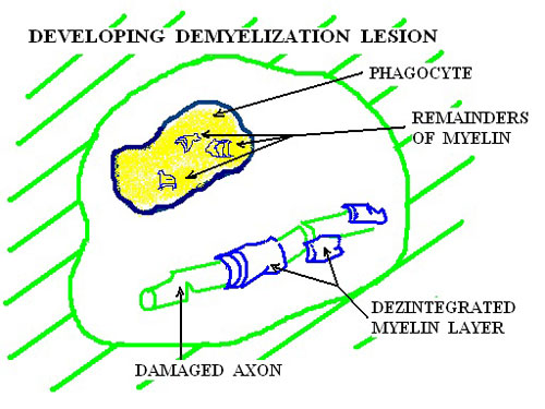 – în placa care este în formare se găsesc fragmente de mielină dezintegrate, fagocite care înglobează fragmentele dezintegrate spre a le îndepărta din zonă și axoni neuronali deteriorați;