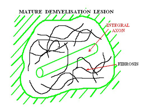 – în placa matură sunt axoni integri, înconjuraţi de filete de fibroză cicatricială.