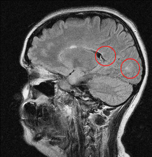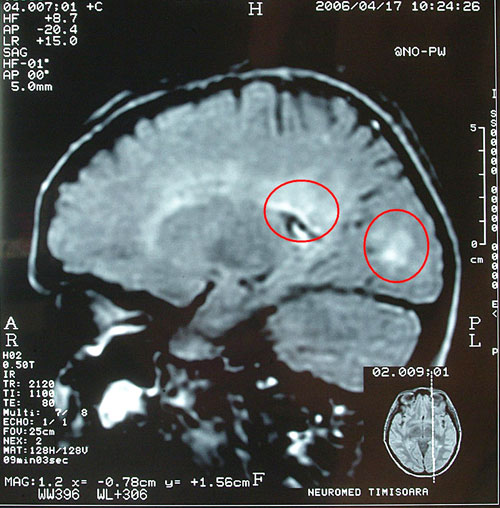 Exemplu: imagini RMN cu placa de demielinizare (aspect de placă albă) dispărută (periventricular) și alta mult micșorată (zona occipitală) în cursul api-fito-terapiei