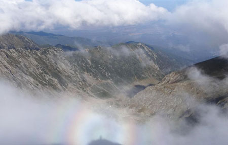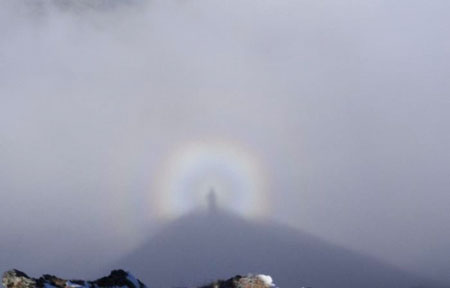 Acest fenomen apare atunci când o persoană stă pe un vârf de munte, cu soarele în spate, deasupra unui plafon de nori sau de ceaţă. Umbra acestei persoane, împreună cu vârful muntelui, se reflectă pe norii sau pe ceaţa de mai jos, iar cele două umbre sunt încadrate central de un curcubeu circular denumit „spectru”, a explicat autorul fotografiei pentru sursa citată.