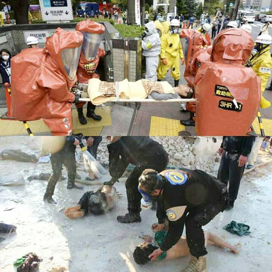 Un prim exemplu vizibil, în poza de mai jos, voluntarii din White Helmets (Căştile Albe), organizaţie umanitară ce are legături cu Al-Qaeda, sosiţi la faţa locului, manevrează cadavrele oamenilor ucişi fără suficient echipament de protecţie, în mod particular, fără măştile şi mănuşile pe care ar fi trebuit să le aibă în urma unui astfel de atac.