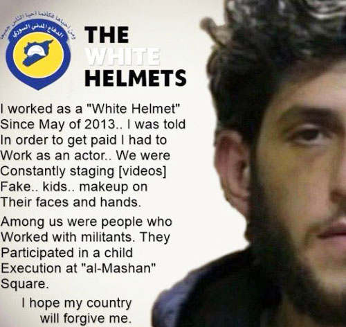 Voluntar White Helmets (Căştile Albe) ce s-a predat armatei siriene la Alep recunoscând că a fabricat materiale video în care erau prezentaţi copii ucişi de către forţele pro-guvernamentale siriene: