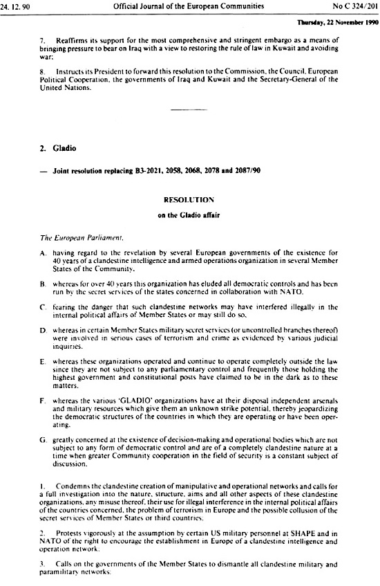 Această rezoluţie din 1990 a Parlamentului European este un act excepţional, pentru că e prima dată în istorie când un organism oficial internaţional recunoaşte că terorismul este creat şi întreţinut de serviciile secrete. Rezoluţia Parlamentului European arată clar că „serviciile militare secrete (sau ramuri necontrolate ale acestora) au fost implicate în cazuri grave de terorism și crimă organizată” şi că „anumite forţe militare ale SUA și NATO să fi încurajat crearea în Europa a unei rețele clandestine de informații și operaţiuni“. Ceea ce documentul oficial european vrea să spună este aceea că CIA şi NATO au creat structuri clandestine militare, care au susţinut activităţi de terorism pe teritoriul Europei.