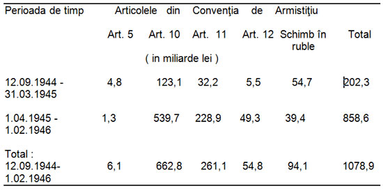 În perioada începând din 12 septembrie 1944 până la 31 ianuarie 1946, Guvernul român a adunat suma de 1.263 miliarde lei (din care 1.079 miliarde lei au fost cheltuite efectiv, iar 184 miliarde lei rămase) pentru a face faţă obligaţiilor care decurg din Convenţia de Armistiţiu, precum şi acordurilor semnate la Moscova în septembrie 1945.