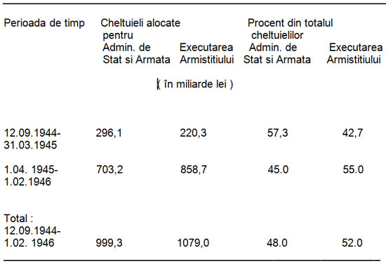 Cheltuielile Statului pentru administrare şi pentru armată pe perioada începând din 12 septembrie 1944 până la 1 februarie 1946 au fost comparativ cu cheltuielile cerute de îndeplinirea Armistiţiului după cum urmează: