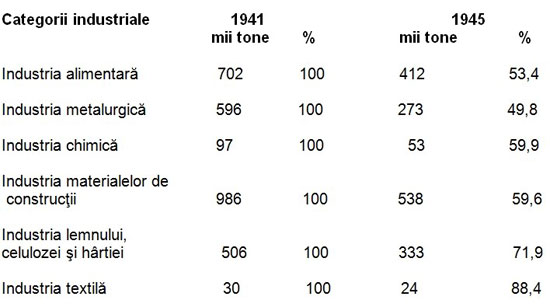 Producţia generală a industriei s-a diminuat cu 45% comparativ cu producţia din 1941.