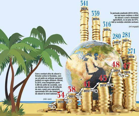 Cele 34.044 firme din România care au, în prezent, acţionari persoane juridice, 6.045 au legătură cu paradisuri fiscale din Cipru, Andorra, Insulele Virgine Britanice, Seychelles, Insulele Cayman, Luxemburg, Cipru, Gibraltar, Bermude, Malta, Bahamas, Olanda, Barbados, Belize, Hong Kong, Lichtenstein, Insulele Man, Liberia, Dubai, Insulele Marshall, Aruba, Antilele Olandeze.