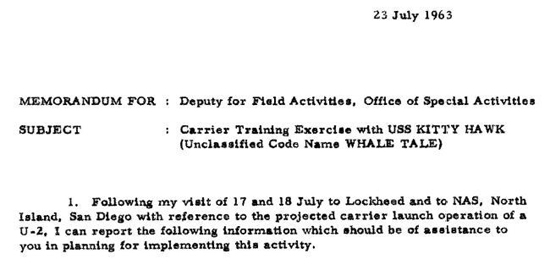 În documentul de mai sus se arată apoi că directorul departamentului secret Skunk Works al companiei Lockheed Martin, Kelly Johnson, a ajutat CIA să lanseze avionul-spion U-2 de pe portavionul USS Kitty Hawk.