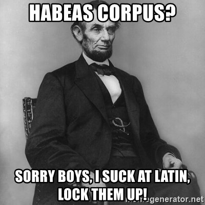 [traducere text fotografie: Habeas Corpus? Îmi pare rău, băieți, nu mă pricep defel la Latină, aruncați-i în închisoare!]