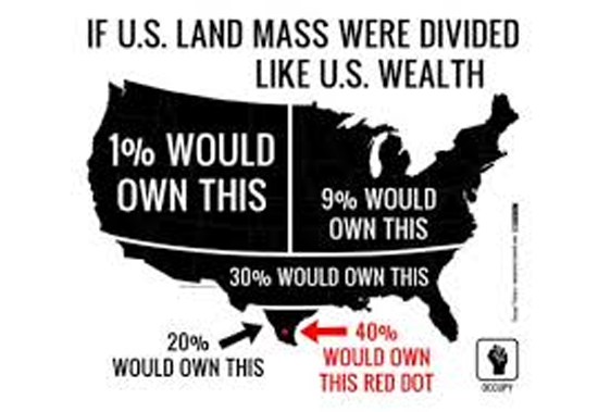 [traducere text fotografie: Dacă teritoriul Americii ar fi împărțit așa cum sunt împărțite averile: 1% ar deține bucata aceasta, 9% ar deține bucata aceasta, 30% ar deține porțiunea aceasta, 20% ar deține zona aceasta, iar 40% ar deține acest punctuleț roșu]