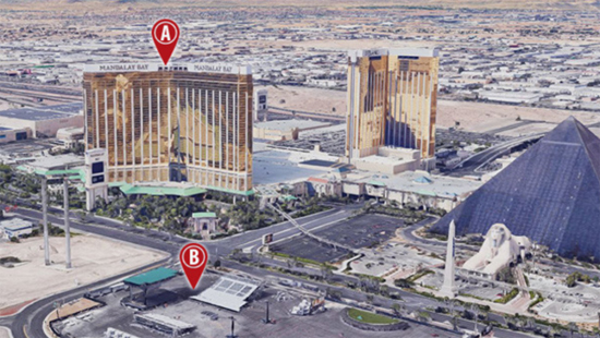 A – hotelul Mandalay Bay; B – piața în care s-a desfășurat concertul