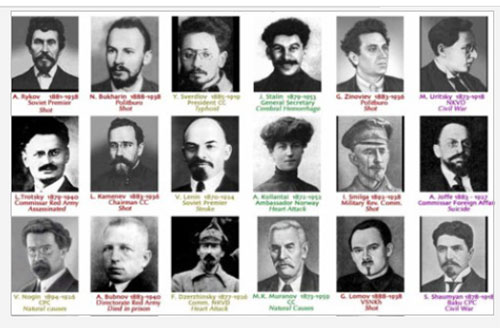 Din componenţa primului Birou Politic, constituit la 25 martie 1919, din care făcuseră parte 5 membri permanenţi: Lenin (Ulianov), Kamenev (Rozenfeld), Krestinski, Stalin (Djugasvili), Troţki (Bronstein), niciunul nu era rus.