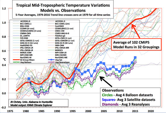 Figura 1. Modele climatice vs. Observații ale variațiilor temperaturilor tropicale din troposfera mediană. Există 102 modelări și trei seturi diferite de măsurători. Începând din 1996, se înregistrează o diferență semnificativă între modelele conținând gaze antropogene cu efect de seră și cele trei seturi de observații.