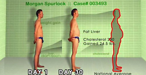 În anul 2003, Morgan Spurlock, un producător american de film, a făcut un documentar (Super Size Me) privind efectele alimentaţiei McDonaldʼs asupra sănătăţii populaţiei. Pentru a fi cât mai convingător, şi-a asumat el însuşi o dietă integral McDonaldʼs, trei mese pe zi timp de 30 de zile. Starea lui de sănătate a fost monitorizată în toată această perioadă de trei medici. Rezultatele au fost mai mult decât relevante. În numai 30 de zile, producătorul şi protagonistul documentarului, ca urmare a dietei tip fast-food, s-a îngrăşat 11,1 kg, pe care le-a dat jos după aceea în nouă luni de zile, cu ajutorul unei diete vegane şi a mai multor cure de detoxifiere! De-a lungul celor 30 de zile, masa musculară i-a scăzut semnificativ, i-a crescut colesterolul şi s-a ales cu importante disfuncţii sexuale. Ficatul i-a fost afectat, apărând chiar „sindromul ficatului gras”, iar din a 21-a zi au început să apară palpitaţiile, ceea ce i-a determinat pe medici să-i ceară să renunţe la experiment – fapt care nu s-a petrecut. Din punct de vedere psihologic, Spurlock a început să sufere de dureri de cap, depresie, stări de letargie şi de aşa-numitele mood swings, adică schimbări în stările psihice care afectează atenţia, concentrarea, stările emoţionale, putând conduce, în timp, la depresie bipolară sau la alte afecţiuni psihice.
