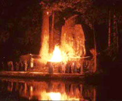 Mii de bărbaţi au început să se strângă pe malul estic. Slujitorii personali ai membrilor clubului (spre deosebire de angajaţii Bohemian Grove, care purtau cu toţii tricouri roşii şi care nu au avut voie să fie prezenţi la ritual) au început să pună scaune pentru cei dintre ei care erau mai în vârstă. Soarele era acum de mult apus. Era întuneric complet şi nu puteam vedea nici măcar malul celălalt al lacului. Mulţi lilieci zburau de jur-împrejur şi deasupra apei era multă ceaţă (este multă ceaţă în nordul Californiei). Era o atmosferă înspăimântătoare. La un moment dat, a început să se ridice părul pe mine.