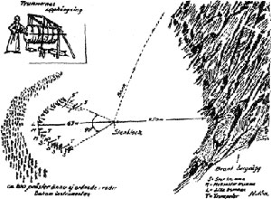 Locul propus era o stâncă înaltă de peste 100 m. La 250 m de baza ei, pe un mic platou, fuseseră aduse, cu ajutorul animalelor, blocurile mari de piatră de formă cubică. În centrul platoului se afla „suprafaţa de lansare”: o micuţă platformă de piatră, în formă de farfurie, cu diametrul de 1 m şi adâncă de aproximativ 15 cm. La 63 m în spatele acestui loc sunt plasaţi pe circumferinţa unui cerc cu centrul în platforma de piatră, 19 „muzicieni”, alcătuind un sector circular, fiind separaţi între ei prin intervale corespunzătoare unui unghi de 5 grade. Ei constituie astfel „un perete muzical” cu o lungime de un sfert de cerc. La 12 m în spatele acestora şi paralel cu ei, se află un grup de 190 de călugări, astfel încât în spatele fiecărui „muzician” din primul rând se află 10 călugări, în linie, ca razele unui cerc. Poziţia „platformei de lansare” şi a celor două grupe de muzicieni au fost determinate foarte exact cu ajutorul unei corzi de piele cu noduri echidistante.