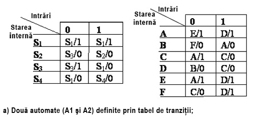 De exemplu, pentru automatul A1: dacă automatul este în starea S2 şi primeşte intrarea “0”, el va trece în starea S3 cu ieşirea 0; dacă este în starea S2 şi primeşte intrarea “1”, va trece în starea S2 cu ieşirea 0.