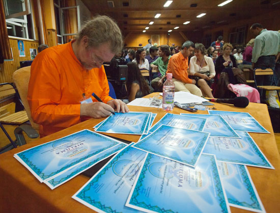 Swami Mahalayananda, semnând diplomele primite de cei care au susținut conferințe în cadrul Congresului.
