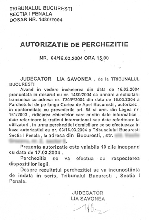 În autorizaţiile de percheziţie având numărul 63 şi 64, eliberate de către judecătoarea Lia Savonea la cererea procurorului George Bălan, se precizează dispunerea efectuării percheziţiilor domiciliare la un număr de 16 imobile şi ridicarea obiectelor care conţin „date informatice, date referitoare la traficul informaţional sau date referitoare la utilizatori”.