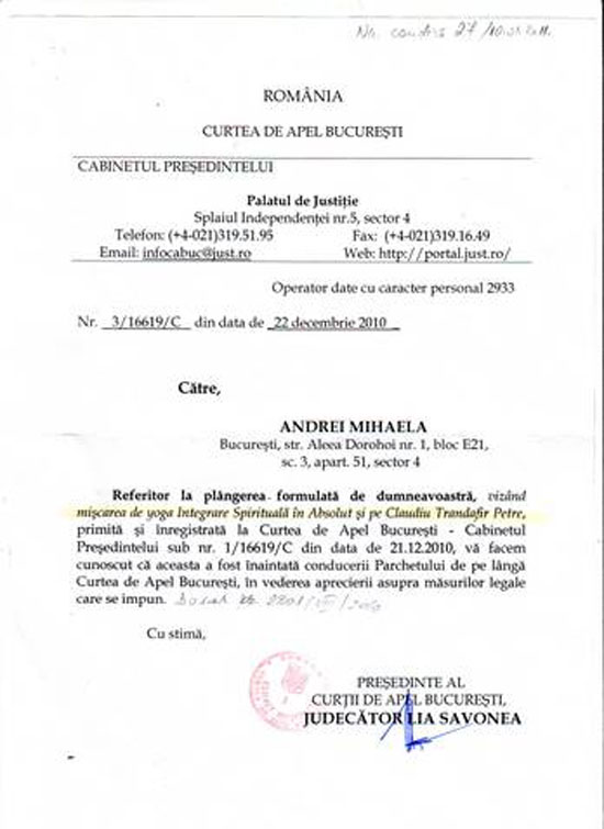 Aşa cum ştim, Parchetul nu a demarat niciun fel de acţiune penală în cazul plângerilor îndreptăţite depuse de yoghini în urma percheziţiilor din martie 2004, plângeri care semnalau diferitele ilegalităţi, abuzuri şi persecuţii evidente din partea organelor de anchetă – în ultimii ani s-au depus peste 600 de astfel de plângeri. În schimb, am aflat cu stupoare că Parchetul a deschis un nou dosar împotriva MISA pe baza plângerii unei femei în mod evident nebune, plângere care este total incoerentă şi aberantă. Această femeie se numeşte Mihaela Andrei şi se pare că a făcut o fixaţie la adresa şcolii noastre de yoga şi a unor foşti sau actuali membri ai acesteia. Această femeie nebună solicită, printre altele, să îi fie redat trupul pe care îl avea înainte de a se înscrie la cursurile de yoga, sau pentru a o cita, „anterior mişcării de yoga”. Printre alte acţiuni iraţionale şi nebuneşti ale acestei femei se numără şi un episod straniu şi violent, în care ea a spart geamul termopan de la uşa Bibliotecii MISA. Cu acea ocazie, Poliţia a refuzat să ia în considerare plângerea îndreptăţită depusă de reprezentanţii MISA împotriva acestei persoane, pe motiv că ea este în mod evident nebună.