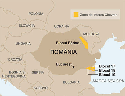 Compania Chevron a început operaţiunile de explorare în România în anul 2010, obţinând concesiuni pentru trei zone de la malul Mării Negre. Aceste concesiuni încă aşteptau aprobarea oficială din partea Guvernului la începutul anului 2012. În anul 2011, a fost adăugată o suprafaţă semnificativă de 6.100 km² prin concesionarea zonei de lângă Bârlad.