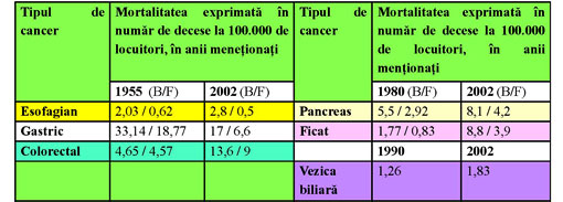 Datele culese de o echipă de medici români referitoare la „evoluţia” în ultima jumătate de secol a numărului de decese prin diferite tipuri de cancer digestiv sunt redate în tabelul de mai jos. Nu pentru toate tipurile de cancer digestiv s-au putut culege date pe durata a cinci decenii, după cum se poate observa. La majoritatea tipurilor de cancer digestiv s-a observat o creştere în timp a numărului de decese raportat la 100.000 de locuitori, cu excepţia cancerului gastric, atât la bărbaţi (B) cât şi la femei (F).