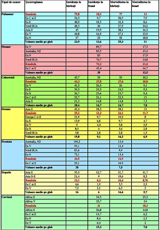 În ceea ce priveşte ţara noastră, se pot observa anumite valori de „top” pentru diferite tipuri de cancer (pulmonar, colorectal, gastric) comparativ cu alte zone sau regiuni ale lumii, pe anumiţi ani în mod specific. Astfel, spre exemplu, studiul care a purtat numele de Globocan, realizat în 2008 la nivel mondial, a putut obiectiva frecvenţa numărului noi de cazuri şi a deceselor asociate diferitelor tipuri de cancer pe regiuni specifice şi în ţările lumii, inclusiv România (tabelul de mai jos).