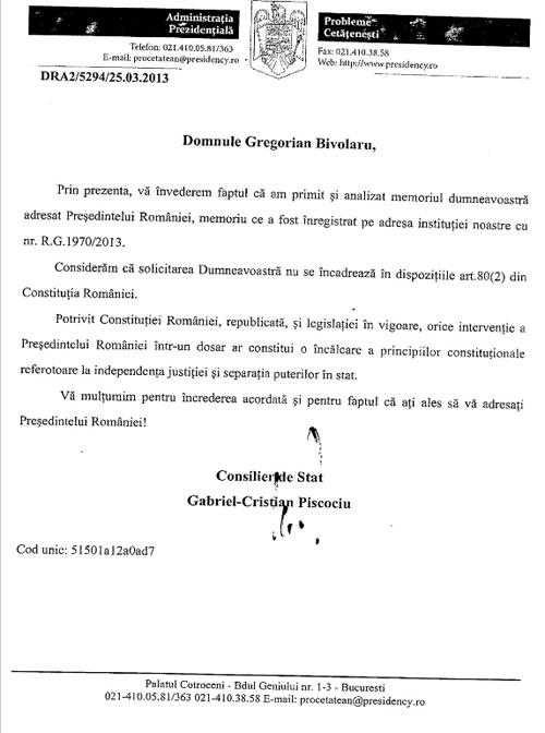 Acest răspuns este de fapt o escamotare stângace a unui refuz, în primul rând pentru că ceea ce Gregorian Bivolaru i-a solicitat Președintelui României, Traian Băsescu, nu a fost câtuși de puțin intervenția acestuia în dosarul în care este judecat la ÎCCJ, ci numai exercitarea rolului fundamental al Președintelui: de a media între puterile statului (aici fiind inclusă și puterea judecătorească!), precum și între stat și societate sau un reprezentant al societății (în acest caz, Gregorian Bivolaru) și de a lua (evident, după verificarea faptelor expuse în memoriu) toate măsurile legale ce se impun în cazul acestui derapaj foarte grav al actului de justiție! Aceasta este în mod clar stipulat în Constituția României (Capitolul 2, articolul 80, aliniatul 2):