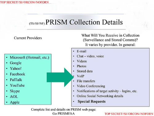 Agenţia de securitate NSA are, prin intermediul acestui program secret, acces direct în sistemele marilor companii de software şi internet cum ar fi: Microsoft, Skype, Apple, Google, Facebook, Yahoo etc. Aşa cum se vede în schema de mai jos, NSA colectează toate informaţiile referitoare la clienţii companiilor enunţate.