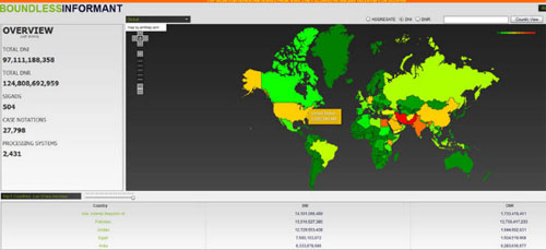 În imaginea alăturată puteţi vedea harta supravegherii electronice la nivel global. Intensitatea monitorizării este cea mai redusă în zonele colorate cu verde închis şi ea creşte progresiv în zonele cu verde, galben şi respectiv, portocaliu, iar zonele roşii sunt cele mai supravegheate. Conform datelor furnizate de Boundless Informant, într-un interval de 30 de zile încheiat în martie 2013, au fost colectate aproape 3 miliarde de date, numai de la rețelele de calculatoare din Statele Unite.