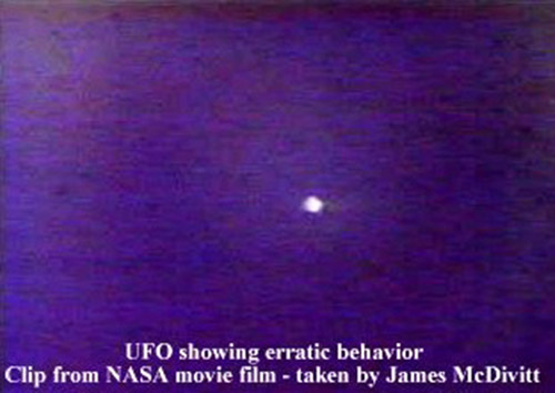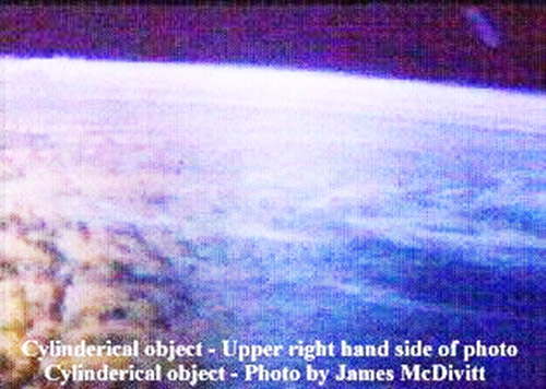 Fotografie a unui OZN de formă cilindrică (dreapta sus a imaginii) realizată de către astronautul James Mcdivitt în timpul misiunii spaţiale Gemini 4