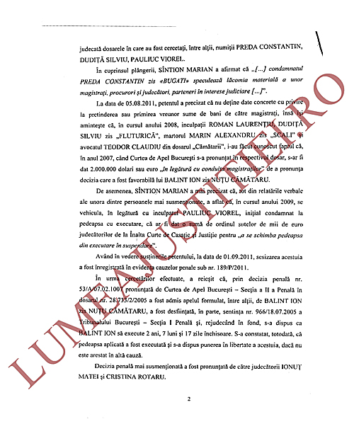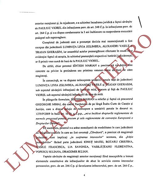 Cu toate acestea, ordonanța la care ne-am referit precizează că din actele premergătoare efectuate de procuroarea Carmen Rusu (din cadrul DNA) nu au reieșit suficiente indicii privind săvârșirea infracțiunii de luare de mită care a fost sesizată la DNA de procurorul Sintion, astfel că la data de 15 noiembrie 2011 s-a dispus neînceperea urmăririi penale (NUP) față de judecătorii ÎCCJ Ionuț Matei, Cristina Rotaru, Luminița Livia Zglimbea, Alixandri Vasile și Traian Gherasim, precum și disjungerea cauzei sub aspectul infracțiunilor de abuz în serviciu și favorizarea infractorului și declinarea competenței dosarului în favoarea Secției de urmărire penală a Parchetului Înaltei Curți de Casație și Justiție, față de magistrații Gheorghe Mihai, Iuliana Popescu, Cristina Rotaru, Francisca Vasile, Ionuț Matei, Iulian Dragomir, Lia Savonea și Florentina Vasilăteanu.