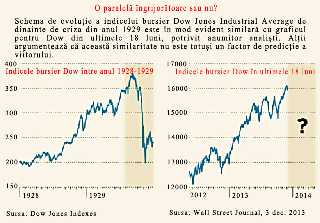 În luna decembrie 2013, analistul Mark Hulbert de la Market Watch (o publicație care ține de Wall Street Journal) a publicat un articol în care prezenta similitudinile dintre graficul bursei de valori actuale și graficul bursei din 1929, urmărind totodată să examineze posibilitatea conform căreia bursa de valori ar urma să se apropie de un nivel maxim. Potrivit analizei comparative a celor două grafice (dacă este considerată valabilă corelația dintre ele), piața ar fi atins un nivel maxim la mijlocul lunii ianuarie, urmând apoi să avem de-a face cu o piaţă în scădere.