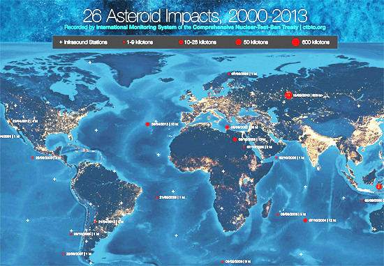 Ed Lu, Tom Jones și Bill Anders au evidențiat faptul că în ultima decadă au existat de trei până la 10 ori mai multe impacturi cu asteroizi decât se credea anterior. Afirmațiile lor se sprijină pe date colectate de sistemul internațional de monitorizare al Organizaţiei Tratatului de Interzicere a Experimentelor Nucleare (CTBTO). Între anii 2001 și 2013, rețeaua de senzori proiectată pentru a detecta infrasunetele emise de detonarea clandestină a unor bombe nucleare a înregistrat 26 de explozii majore, care nu au fost provocate de experimente nucleare ci de impactul asteroizilor. Puterea acestor explozii a fost cuprinsă între 1 și 600 de kilotone. Prin comparație, bomba de la Hiroshima a avut puterea de 15 kilotone. Cei mai mulți asteroizi au ajuns deasupra oceanelor sau în zone izolate, nepopulate și nu au provocat probleme semnificative. Aici puteți consulta o listă a celor 26 de evenimente, în care sunt menționate locul și puterea impactelor asteroizilor.