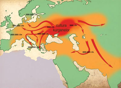 Începând cu anul 4400 î.e.n., Vechea Europă a început să fie invadată de populația kurgan (cunoscută și sub denumirea de populația indo-europeană), în trei valuri succesive. Poporul kurgan era un popor de războinici violenți, ce venerau zei ai cerului și ai războiului.