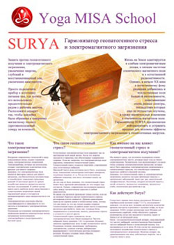Pe de altă parte, aparatul SURYA este conceput ca un armonizator global care poate face să dispară aproape toate efectele negative ale poluării electromagnetice din ambianţa imediată. Cităm din prezentarea acestui aparat: „După multe cercetări şi teste, a fost pus la punct un foarte puternic şi performant armonizator ce poate fi utilizat pentru a neutraliza şi îndepărta efectele nocive pe care le au poluarea electromagnetică şi stresul geopatic asupra fiinţelor umane.” Stresul geopatic este generat de energiile care şi-au pierdut vibraţiile naturale şi astfel sunt dizarmonioase şi ne pot afecta, de exemplu, prin slăbirea sistemului imunitar.