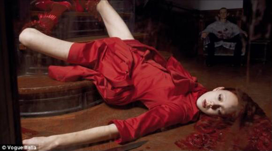 Într-un pictorial al revistei Vogue Italia, intitulat Cinematic, hainele de firmă sunt combinate cu elemente precum abuzul, dezumanizarea şi moartea.