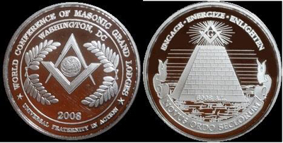 În imaginea de mai jos se observă o monedă de argint creată în ediţie limitată pentru participanţii la Conferinţa Mondială a Marilor Loje Francmasonice care a avut loc în Washington D. C., în 28 martie 2008. Pe cele două feţe ale monedei apar faimoasele simboluri masonice compasul şi piramida cu ochiul atotvăzător în vârf.