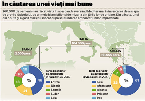 În luna august, în numai o săptămână, aproximativ 5.300 de persoane, provenind în principal din Africa subsahariană, au fost salvate pe Mediterana, în cadrul mai multor zeci de operaţiuni de salvare efectuate de către Marina italiană sau Misiunea europeană Triton.