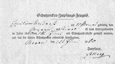 Dr. Loibner: „Asta ca să vă lămuriţi ce este de fapt vaccinarea din perspectiva istorică. Iată o aşa-numită «adeverinţă de vaccinare cu variola protectivă» (Schutzpocken-Impfungs-Zeugnis), datată din 1860.