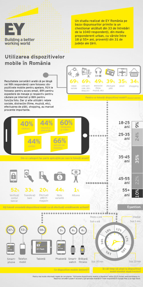 Studiul EY scoate în evidenţă şi utilizarea unui număr mare de aplicaţii, ceea ce se explică şi prin categoriile diverse din care acestea fac parte: 66% dintre respondenţi folosesc aplicaţii din categoria business, 60% din categoria foto & video, 46% din categoria muzică şi entertainment, cele mai coborâte valori la utilizarea aplicaţiilor le înregistrează categoriile lifestyle (28%), health & fitness (25%) şi sport (17%).