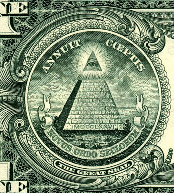 Insigna Ordinului Illuminati-lor care a apărut prima dată pe reversul bancnotei americane de un dolar în 1933. Se poate citi, la baza piramidei cu 13 niveluri, anul 1776 (MDCCLXVI în scriere romană). Ochiul care radiază în toate direcţiile este „ochiul care spionează tot”, care simbolizează agenţia teroristă, asemănătoare Gestapo-ului, care a fost fondată de Weishaupt. Cuvintele latine „ANNUIT COEPTIS” înseamnă „acţiunea (conspiraţia) noastră a fost încununată de succes”. Dedesubt, „NOVUS ORDO SECULORUM” explică natura acţiunii: o „nouă ordine socială” sau o „nouă ordine mondială”.
