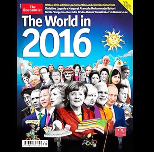 Coperta publicaţiei The Economist 2015 era plină cu simboluri criptice şi predicţii cumplite. Coperta publicaţiei The Economist 2016 prefațează şi ea o serie de evenimente, incluzând, de asemenea, numeroase simboluri ce transmit semnale pentru grupul restrâns al celor care fac jocurile.