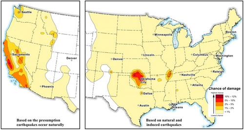 Totuşi, procedeele de injectare de apă reziduală au pus pe harta cu riscuri seismice şase state. Oklahoma prezintă cel mai mare risc, fiind urmată de Kansas, Texas, Colorado, New Mexico şi Arkansas, potrivit USGS. Oklahoma şi Texas au cea mai mare populaţie care locuieşte lângă zone cu risc de cutremure induse de om.
