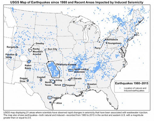 Fiecare punct albastru de pe această hartă reprezintă un cutremur cu magnitudinea de cel puţin 2,5 începând cu anul 1980. Din 1978 până în 2008, există o medie de 24 de cutremure cu magnitudinea de 3, sau mai mari, care au atins zona centrală a SUA în fiecare dintre aceşti ani. Dar începând cu 2009 şi până în 2015, numărul a crescut la o medie de 318 de cutremure pe an, cu magnitudinea respectivă. În 2015 s-au înregistrat cele mai multe cutremure – 1010 cu magnitudinea de 3 sau peste 3.