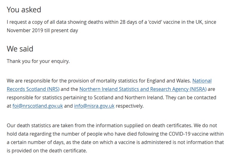 Timp de luni de zile, instituțiile guvernamentale britanice au insistat că nu dețin date privind decesele în funcție de statutul vaccinal. De fiecare dată când a fost depusă o cerere în virtutea libertății de informare, răspunsul primit a fost următorul: